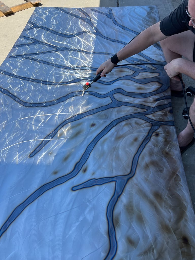 Through a controlled, hands-on process of grinding, flame treatment, and layered paint application, depth and movement emerge organically. No two works are ever identical.
