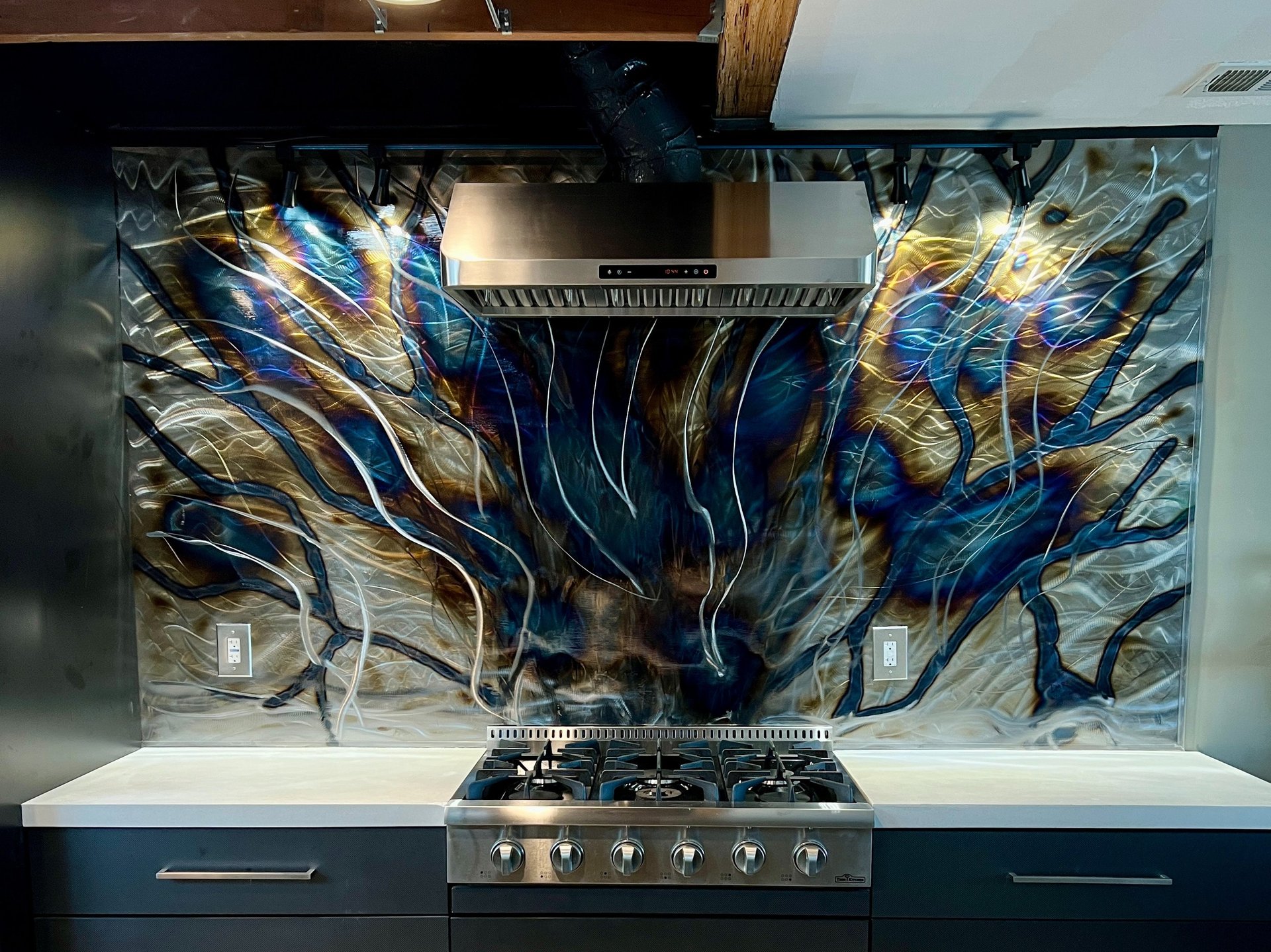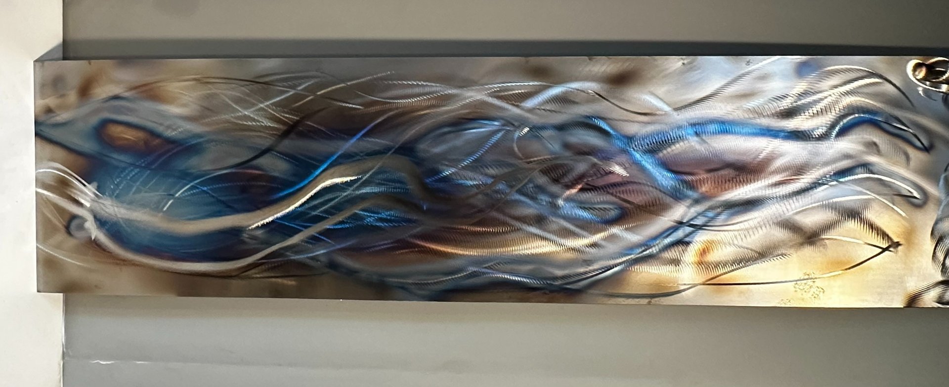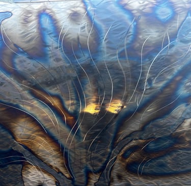 Ground steel and fired to create vibrant colors in shades of amber, blue and purple. Layered paint application, depth and movement organically.