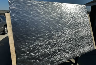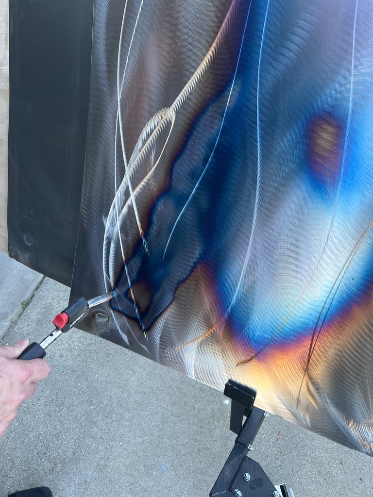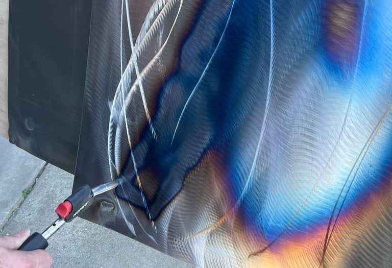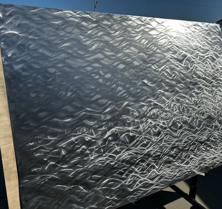 Architectural-scale metal artwork created through a proprietary process of grinding, burning, and layered painting—resulting in dynamic texture, depth, and movement.